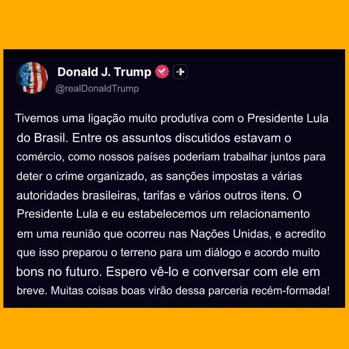 Lula telefonou a Trump no início da tarde. Segundo o Palácio do Planalto, o diálogo, que durou cerca de 40 minutos, teve como eixo central o tarifaço imposto pelos EUA e a cooperação entre os dois países no enfrentamento ao crime organizado. Durante o telefonema, Lula reafirmou o interesse em acelerar a retirada da sobretaxa de 40% que ainda atinge parte dos produtos brasileiros.