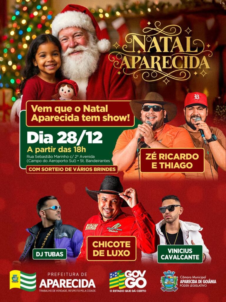 A Prefeitura de Aparecida de Goiânia promove neste domingo, 28 de dezembro, mais uma edição do Natal Aparecida, com programação cultural e festiva no Setor Aeroporto Sul. A partir das 18h, a Rua Sebastião Marinho, esquina com a 2ª Avenida (campo de futebol), será palco de shows musicais, sorteio de brindes e da presença do Papai Noel, que interagirá com crianças e famílias.