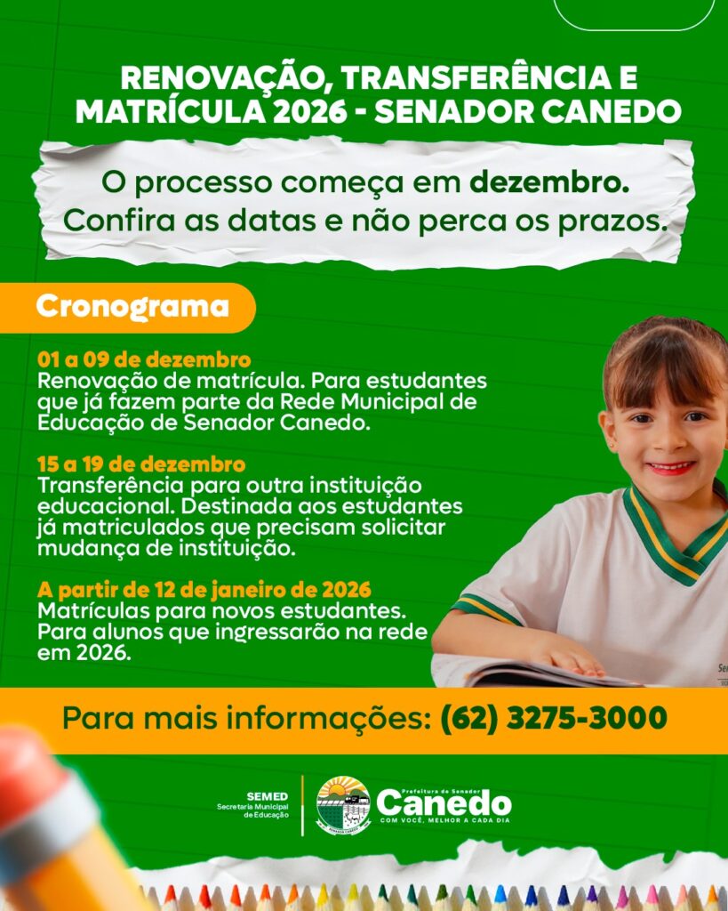 A Prefeitura de Senador Canedo, por meio da Secretaria Municipal de Educação, divulgou o cronograma oficial de matrículas para o ano letivo de 2026. O calendário contempla renovação, transferência e inscrições para novos estudantes da rede municipal.