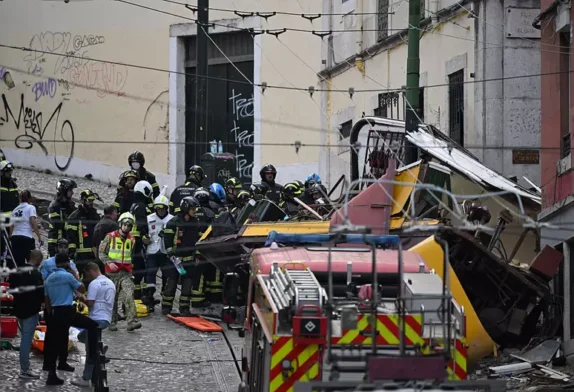 As equipes de resgate e bombeiros estão trabalhando incansavelmente no local do trágico descarrilamento do teleférico da Glória, em Lisboa, Portugal, ocorrido em 3 de setembro de 2025. Foto: Zed Jameson/Anadolu via Getty Images.